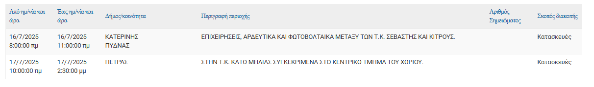 Σύμφωνα με ανακοίνωση της ΔΕΔΔΗΕ Α.Ε., Προγραμματισμένη διακοπή ρεύματος 16/07 και 17/07 στις εξής τοποθεσίες: