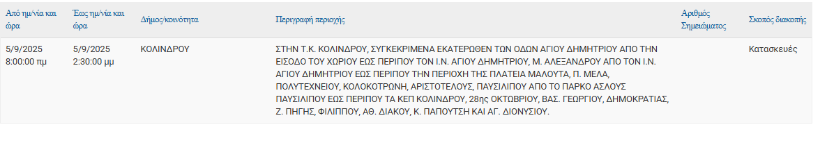 Σύμφωνα με ανακοίνωση της ΔΕΔΔΗΕ Α.Ε., Προγραμματισμένη διακοπή ρεύματος 05/09 στις εξής τοποθεσίες: