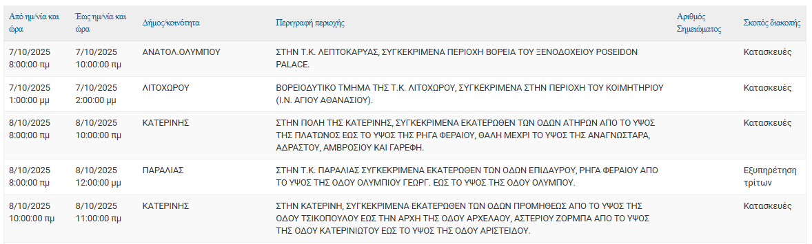 Σύμφωνα με ανακοίνωση της ΔΕΔΔΗΕ Α.Ε., Προγραμματισμένη διακοπή ρεύματος 07/10 και 08/10 στις εξής τοποθεσίες: