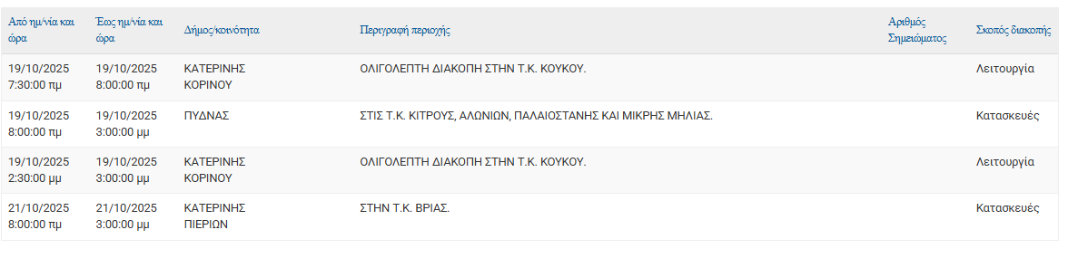 Σύμφωνα με ανακοίνωση της ΔΕΔΔΗΕ Α.Ε., Προγραμματισμένη διακοπή ρεύματος 19/10 και 21/10  στις εξής τοποθεσίες: