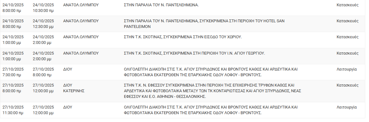 Σύμφωνα με ανακοίνωση της ΔΕΔΔΗΕ Α.Ε., Προγραμματισμένη διακοπή ρεύματος 24/10 και 27/10 στις εξής τοποθεσίες: