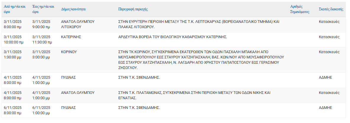 Σύμφωνα με ανακοίνωση της ΔΕΔΔΗΕ Α.Ε., Προγραμματισμένη διακοπή ρεύματος 03/11, 04/11 και 06/11 στις εξής τοποθεσίες: