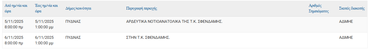 Σύμφωνα με ανακοίνωση της ΔΕΔΔΗΕ Α.Ε., Προγραμματισμένη διακοπή ρεύματος 05/11 και 06/11 στις εξής τοποθεσίες: