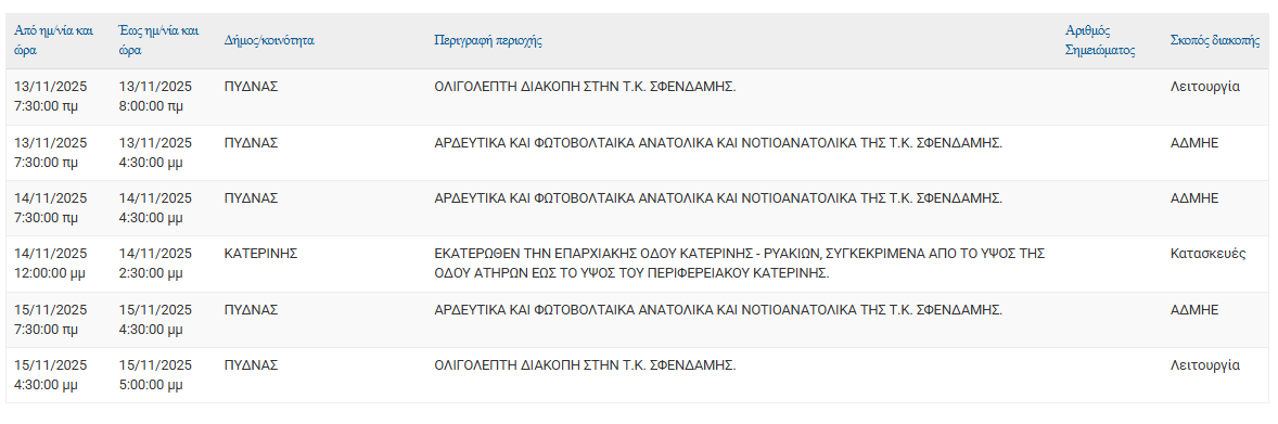 Σύμφωνα με ανακοίνωση της ΔΕΔΔΗΕ Α.Ε., Προγραμματισμένη διακοπή ρεύματος 13/11, 14/11 και 15/11 στις εξής τοποθεσίες: