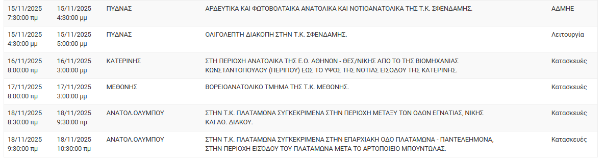 Σύμφωνα με ανακοίνωση της ΔΕΔΔΗΕ Α.Ε., Προγραμματισμένη διακοπή ρεύματος 15/11, 16/11, 17/11 και 18/11 στις εξής τοποθεσίες: