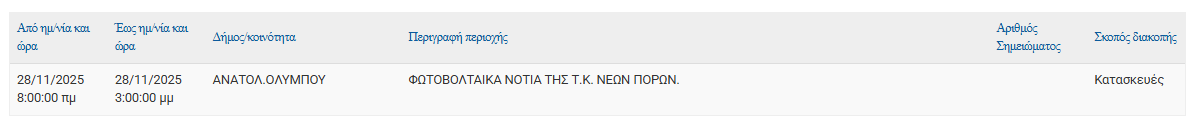 Σύμφωνα με ανακοίνωση της ΔΕΔΔΗΕ Α.Ε., Προγραμματισμένη διακοπή ρεύματος 28/11 στις εξής τοποθεσίες: