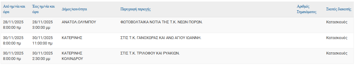Σύμφωνα με ανακοίνωση της ΔΕΔΔΗΕ Α.Ε., Προγραμματισμένη διακοπή ρεύματος 28/11 και 30/11 στις εξής τοποθεσίες: