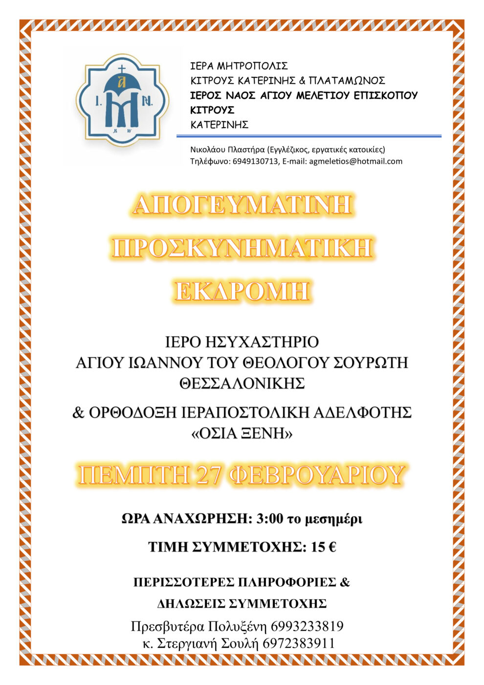 Απογευματινή Προσκυνηματική εκδρομή από τον Ιερό Ναό Αγίου Μελετίου Κατερίνης