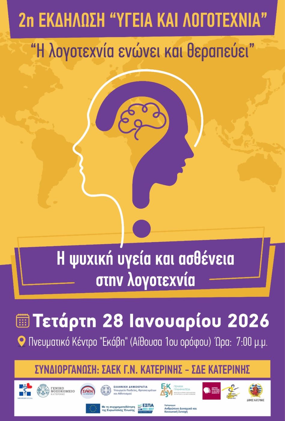 Η ΣΑΕΚ Γ. Ν. Κατερίνης, διοργανώνει στο Πνευματικό Κέντρο του δήμου Κατερίνης στην Εκάβη (αίθουσα ορόφου)την ΤΕΤΑΡΤΗ 28 -1-2026 και ώρες 7μμ-8.30μμ, μαζί με το ΣΔΕ Κατερίνης, τη 2η εκδήλωση «Υγεία και Λογοτεχνία» με θέμα «Ψυχική υγεία και ασθένεια στη λογοτεχνία».