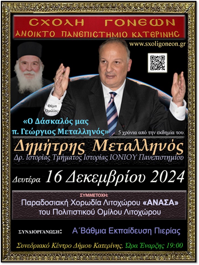 Χορωδιακά τραγούδια από την Παραδοσιακή Χορωδία Λιτοχώρου «ΑΝΑΣΑ» του Πολιτιστικού Ομίλου Λιτοχώρου. Στην συνέχεια ο Δρ. Ιστορίας Τμήματος Ιστορίας του Ιονίου Πανεπιστημίου Δημήτριος Γ. Μεταλληνός με αφορμή τα 5 χρόνια της εκδημίας του πρωτοπρεσβύτερου π. Γεωργίου Μεταλληνού Δρ. Θεολογίας και Δρ. Φιλοσοφίας ενός από τους σπουδαιότερους θεολόγους της εποχής μας θα μιλήσει με θέμα: «Ο Δάσκαλός μας π. Γεώργιος Δ. Μεταλληνός» Συγκεκριμένα: Ποιός είναι ο ορισμός του «Δασκάλου» διαχρονικά, αλλά κυρίως στην εποχή μας; Απαντώντας το κεντρικό αυτό ερώτημα, ο ομιλητής θα προσεγγίσει όλες τις πτυχές της πολύπλευρης Διδασκαλικής προσωπικότητας του μακαριστού «Παπαδοδάσκαλου» π. Γεωργίου Μεταλληνού. Επίσης, θα αναδειχθούν τα τάλαντά του, τα οποία αντιπροσέφερε στην Εκκλησία και τον Λαό του Θεού, καθιστάμενος πρότυπο Διδασκάλου τόσο στο ακαδημαϊκό-επιστημονικό περιβάλλον, όσο και στο κοινωνικό γίγνεσθαι. Η εκδήλωση θα γίνει Στο Συνεδριακό Κέντρο της Κατερίνης (ΕΚΑΒΗ) στις 19:00 και όπως πάντα η είσοδος είναι ελεύθερη. Ο Δημήτριος Γεωργίου Μεταλληνός γεννήθηκε στην Αθήνα (1967), μεγάλωσε στη Δ. Γερμανία και επεράτωσε την εγκύκλιο παιδεία του στο Νέο Ψυχικό (Αθήνα).
