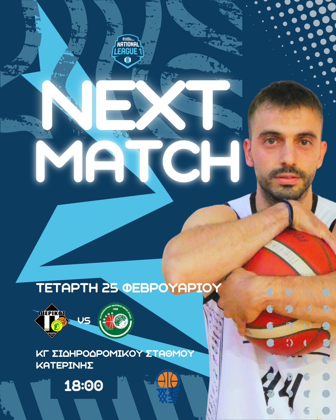 Την Τετάρτη 25 Φεβρουαρίου στις 18:00, ο Πιερικός Αρχέλαος (7-11) υποδέχεται τον ΚΑΟ Δράμας (11-6) στο Κλειστό Γυμναστήριο Σιδηροδρομικού Σταθμού Κατερίνης, για την 20η αγωνιστική της National League 1.