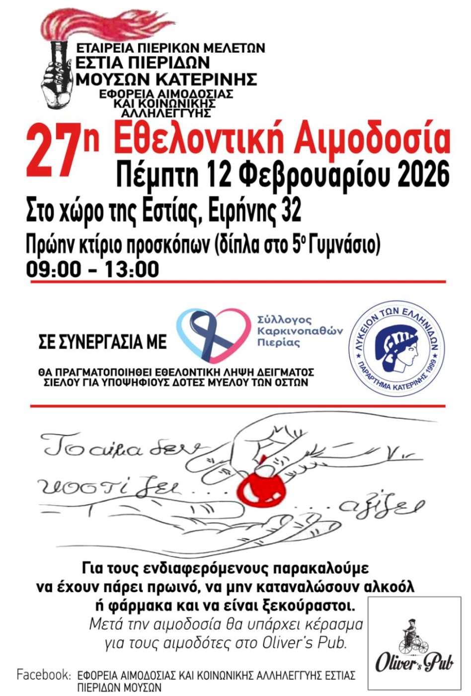 Συνεπείς και πάλι στο ραντεβού με τη ζωή, η Εφορεία Αιμοδοσίας και Κοινωνικής αλληλεγγύης της Εστίας Πιερίδων Μουσών Κατερίνης, σε συνεργασία με την μονάδα Αιμοδοσίας του Νοσοκομείου Κατερίνης και το Λύκειο Ελληνίδων Κατερίνης, καλεί όλους τους πολίτες, που μπορούν να είναι αιμοδότες, να συμμετάσχουν στην καθιερωμένη εθελοντική αιμοδοσία, σήμερα Πέμπτη 12 Φεβρουαρίου 2026, στα γραφεία της Ε.Π.Μ. στην οδό Ειρήνης 32 και ώρα 09π.μ. με 1 μ.μ.