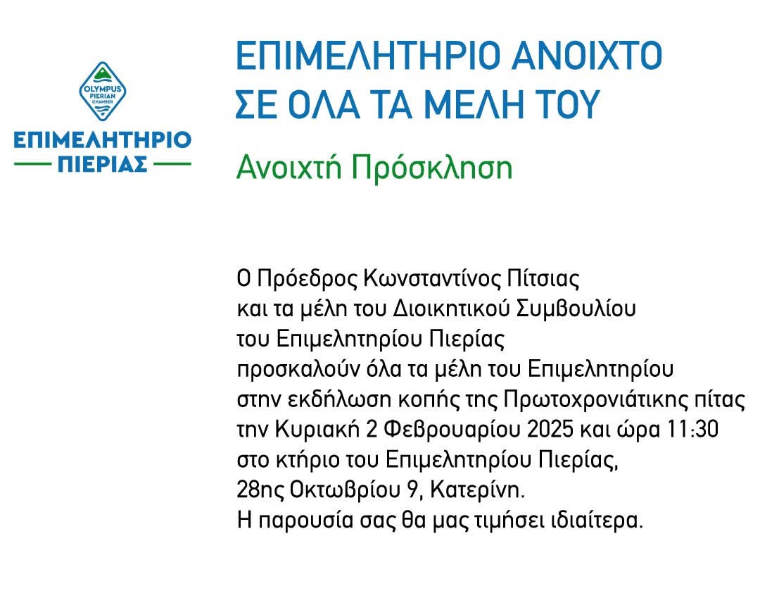 Ο Πρόεδρος Κωνσταντίνος Πίτσιας και τα μέλη του Διοικητικού Συμβουλίου του Επιμελητηρίου Πιερίας σας προσκαλούν στην εκδήλωση κοπής της Πρωτοχρονιάτικης πίτας.