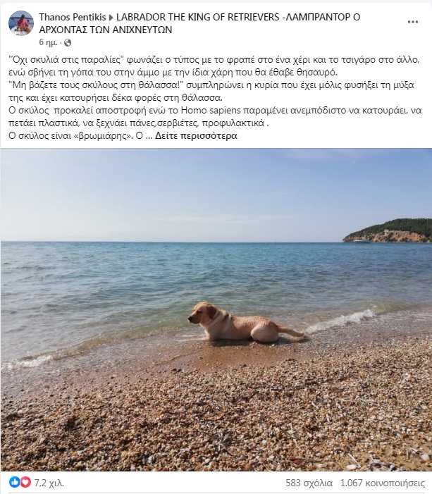 Μια ανάρτηση που έχει γίνει viral στο Facebook θέτει με σκωπτικό, αλλά εύστοχο τρόπο, το ζήτημα της παρουσίας σκύλων στις ελληνικές παραλίες και την υποκρισία που συχνά τη συνοδεύει. Το κείμενο, που κυκλοφορεί ευρέως και έχει αναρτηθεί αρχικά στη σελίδα LABRADOR THE KING OF RETRIEVERS, αποδομεί τα δύο μέτρα και δύο σταθμά που εφαρμόζονται, όταν ένας σκύλος εμφανιστεί στην άμμο.