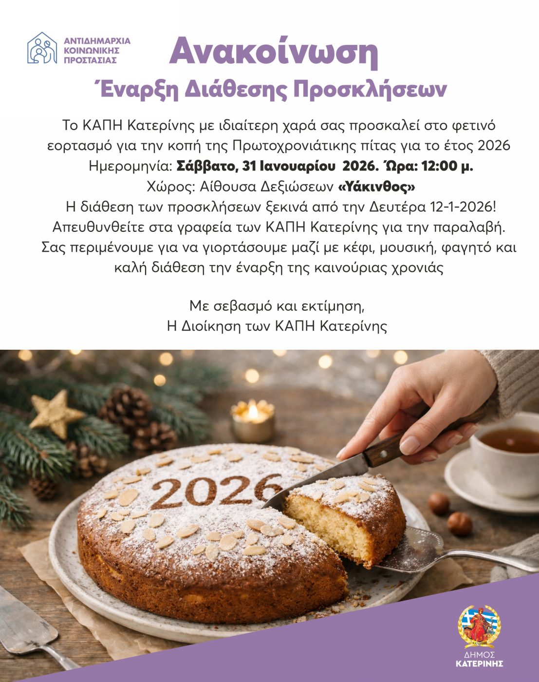 Ανακοίνωση: Έναρξη διάθεσης προσκλήσεων για την εκδήλωση (Σάββατο 31 Ιανουαρίου) κοπής της πίτας του ΚΑΠΗ για το 2026