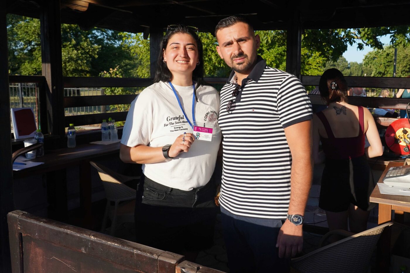 Μαζί τους τα διοικητικά μέλη του ΟΡ.ΦΕ.Ο. η ταμίας Ροδή Ναβροζίδου, ο υπεύθυνος επικοινωνίας και δημοσίων σχέσεων Βασίλη Δήμου και η Μάτα Κούρτη επί της υποδοχής. Δίπλα τους τη βραδιά της έναρξης δύο άνθρωποι του τύπου και μέλη της καλλιτεχνικής επιτροπής, οι Γρηγόρης Γκίνος και Χάρης Μπικηρόπουλος.
