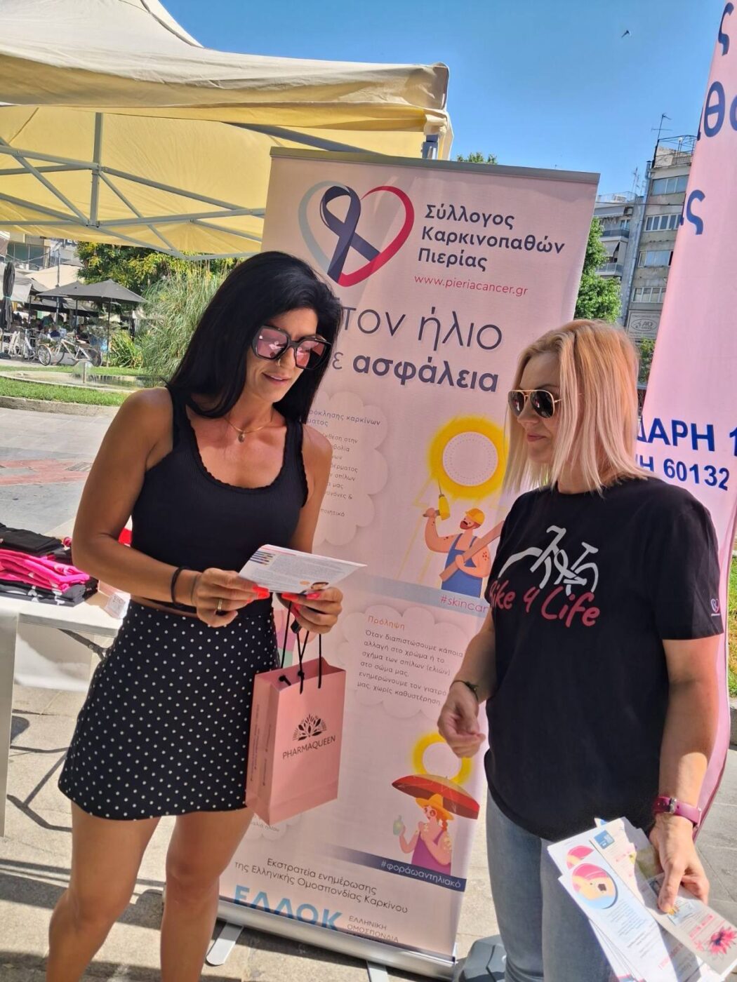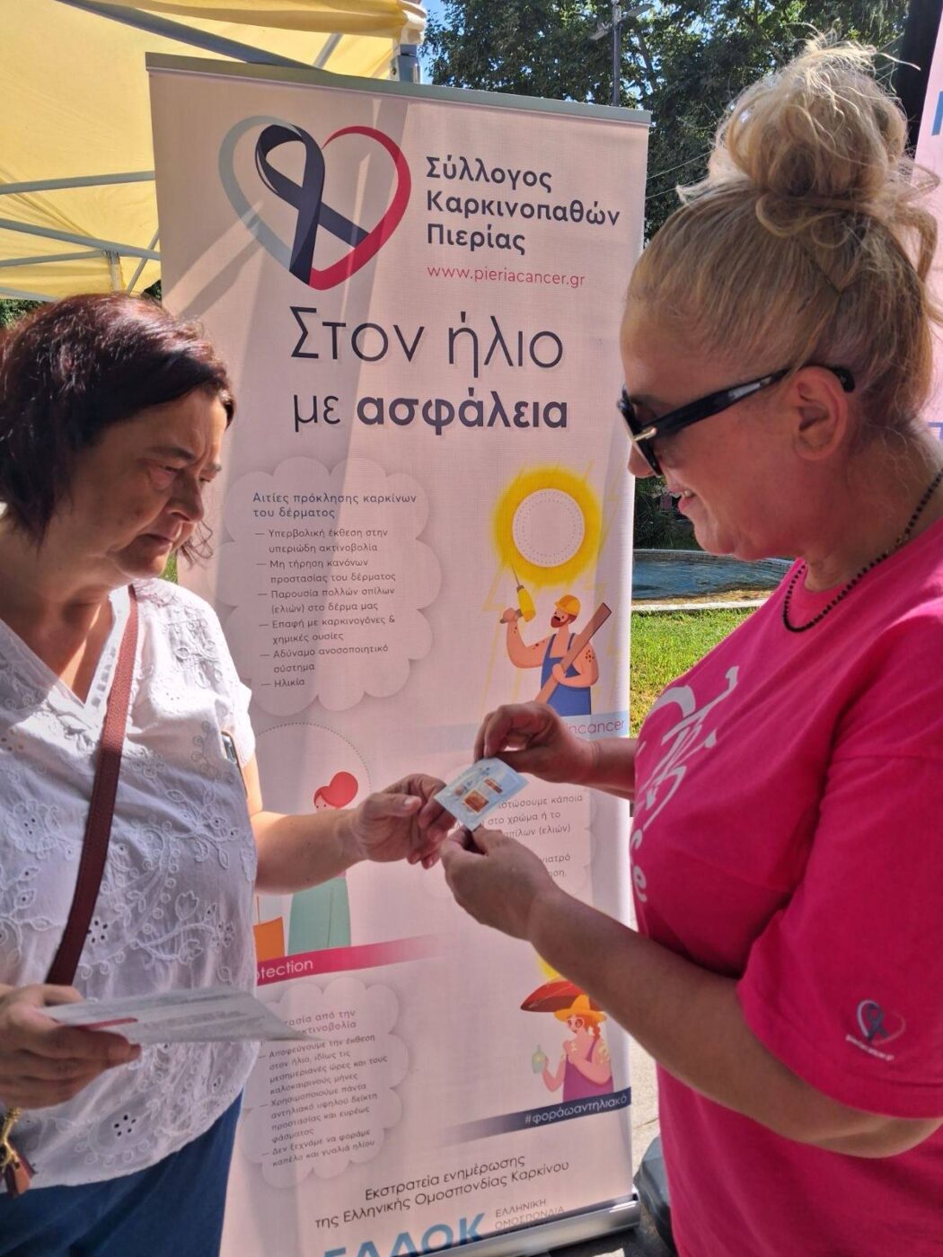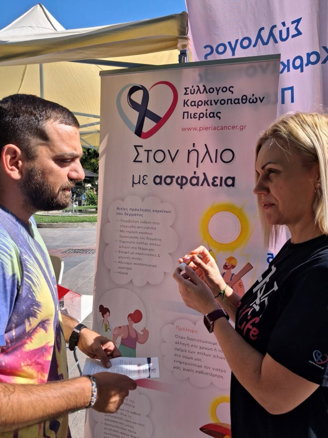 Ο Σύλλογος Καρκινοπαθών Πιερίας ολοκλήρωσε με μεγάλη επιτυχία την πρώτη εκδήλωση της εκστρατείας ενημέρωσης και ευαισθητοποίησης για τον καρκίνο του δέρματος «Στον ήλιο με ασφάλεια». Η εκδήλωση πραγματοποιήθηκε την Τρίτη 24 Ιουνίου 2025 στον πεζόδρομο Κατερίνης, στο ύψος της πλατείας Ελευθερίας προσελκύοντας πλήθος ενδιαφερόμενων πολιτών.