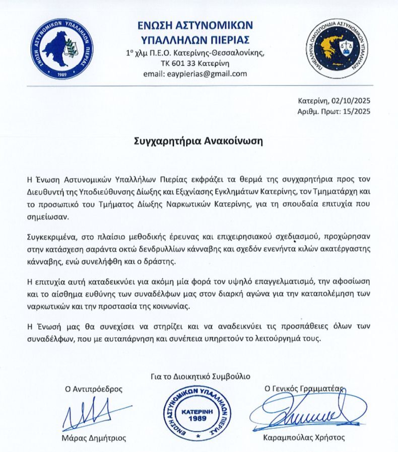 Με επίσημη ανακοίνωσή της, η Ένωση Αστυνομικών Υπαλλήλων Πιερίας εξέφρασε τα θερμά της συγχαρητήρια προς τον Διευθυντή της Υποδιεύθυνσης Δίωξης και Εξιχνίασης Εγκλημάτων Κατερίνης, τον Τμηματάρχη και το προσωπικό του Τμήματος Δίωξης Ναρκωτικών Κατερίνης, για την επιτυχία πρόσφατης επιχείρησης που ενίσχυσε την ασφάλεια στην περιοχή.