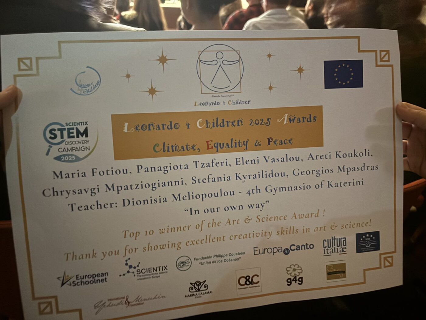 Συγχαίρουμε τα παιδιά μας, Μαρία Φωτίου, Παναγιώτα Τζαφέρη, Ελένη Βασάλου, Αρετή Κουκόλη, Χρυσαυγή Μπατζιογιάννη, Στεφανία Κυραϊλίδου, Γιώργο Μπάσδρα και την καθηγήτρια του 4ου Γυμνασίου Κατερίνης, Διονυσία Μελιοπούλου για την κατάκτηση του 1ου Βραβείου με το έργο τους με τίτλο «In Our Own Way» στην κατηγορία «Τέχνη & Επιστήμη» στο πλαίσιο του διεθνούς διαγωνισμού «Leonardo 4 Children 2025: Κλίμα–Ισότητα–Ειρήνη».