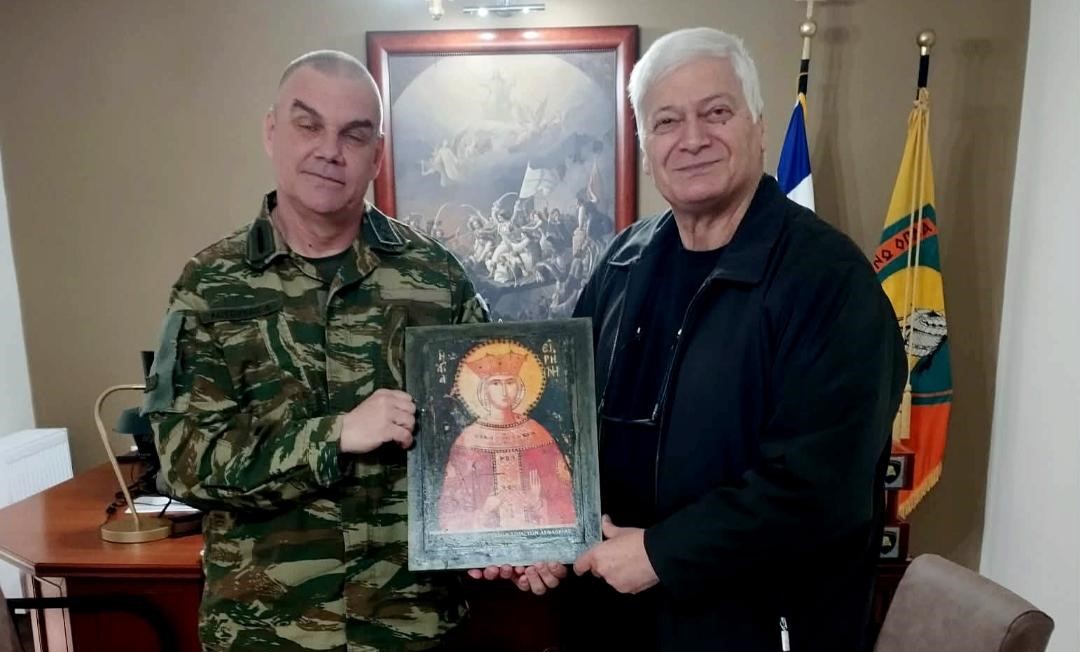 Η εικόνα της Αγίας Ειρήνης που προσφέραμε τον κ. Ταξίαρχο επισφράγισε το ζεστό κλίμα της συνάντησης, την οποίαν φιλοτέχνησε ο καλλιτέχνης μας Δέλλας Χρήστος.