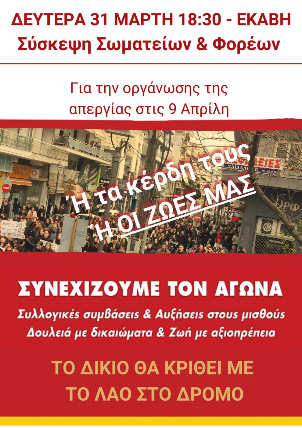 Στις 28 Φλεβάρη ο λαός έκανε την κυβέρνηση και τους μεγαλοεργοδότες να χάσουν τα λόγια τους. Στις 9 Απρίλη να τους κάνουμε να χάσουν τον ύπνο τους. Με το κεφάλι ψηλά και την καρδιά γεμάτη οργή, οργανώνουμε τη μάχη της απεργίας.