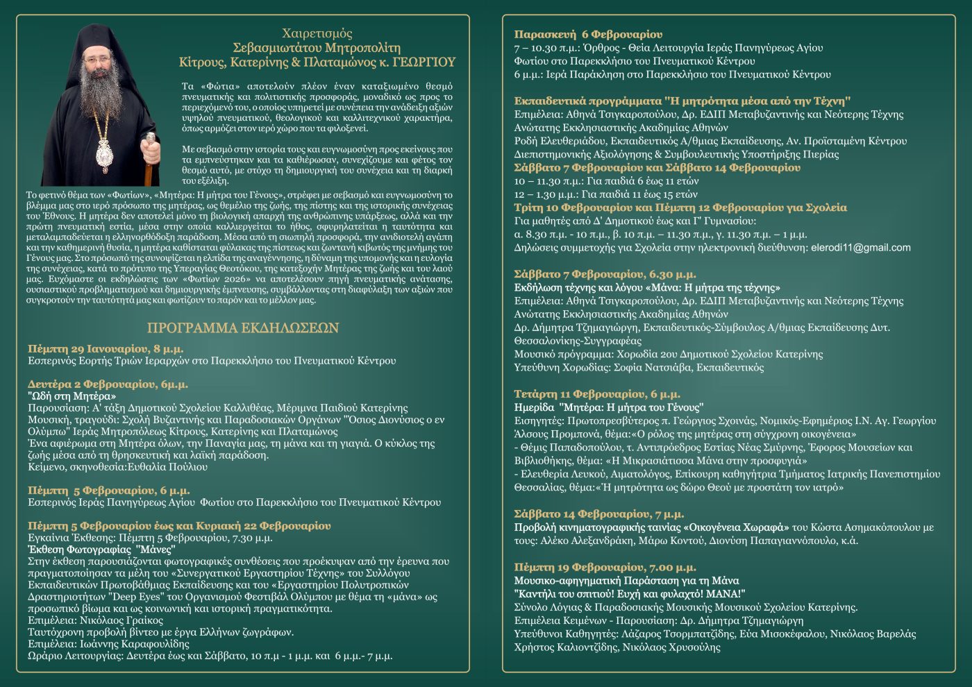 Το πρόγραμμα περιλαμβάνει ποικίλες δραστηριότητες πνευματικού, εκπαιδευτικού και καλλιτεχνικού χαρακτήρα, όπως λατρευτικές εκδηλώσεις προς τιμήν του Αγίου Φωτίου, εικαστικές εκθέσεις εκπαιδευτικά εργαστήρια για μαθητές και σχολικές ομάδες, ημερίδα με καταξιωμένους ομιλητές, μουσικές εκδηλώσεις σε συνεργασία με τα σχολεία της Κατερίνης, με τη συμμετοχή μαθητικών χορωδιών και ορχηστρών, προβολή κινηματογραφικής ταινίας, καθώς και δράσεις λόγου και τέχνης, που προάγουν τη δημιουργική έκφραση και τον πολιτιστικό διάλογο.