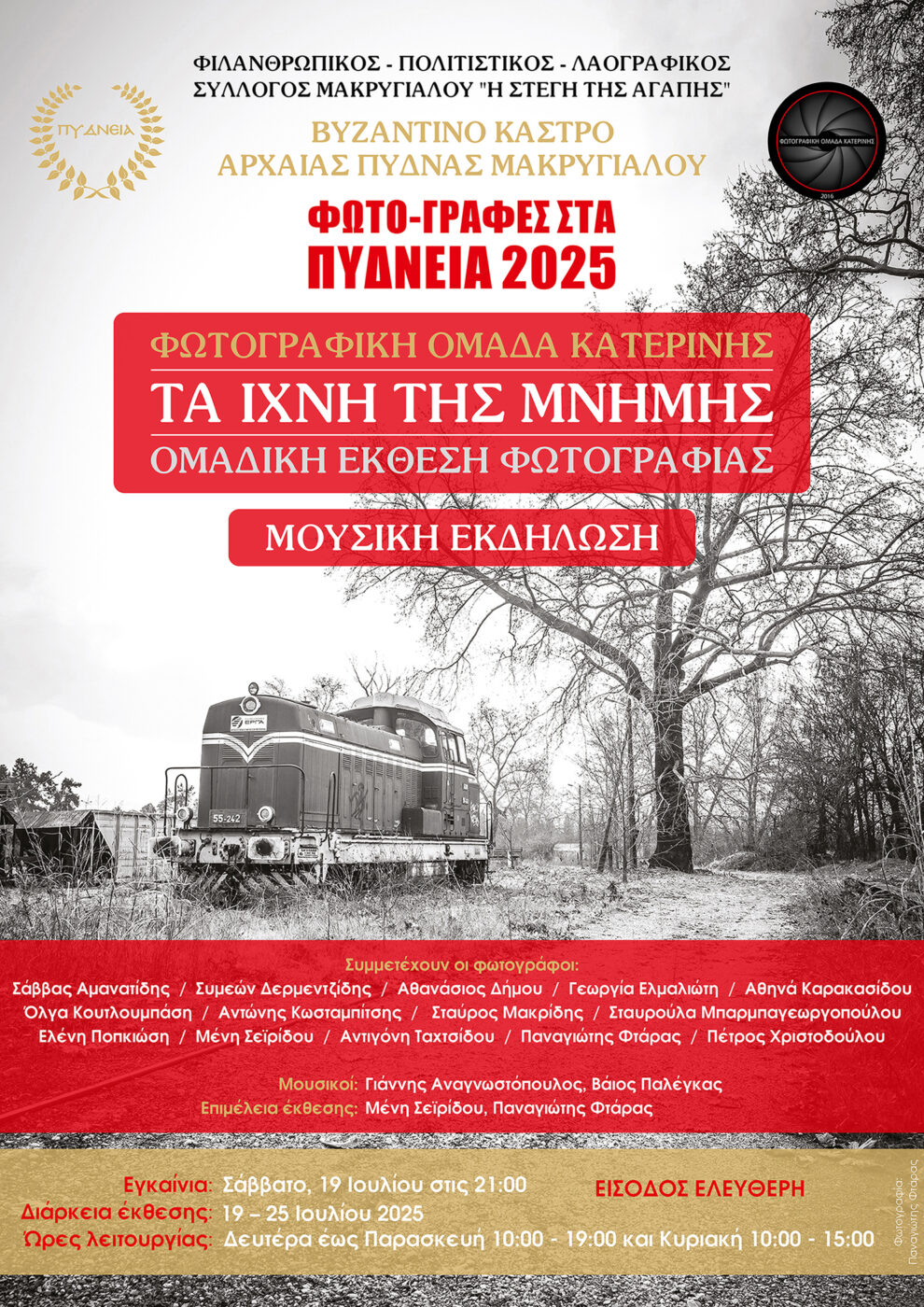 Η Φωτογραφική ομάδα Κατερίνης συμμετέχει φέτος για πρώτη φορά, στις πολιτιστικές εκδηλώσεις «ΠΥΔΝΕΙΑ 25» που διοργανώνονται από τον ΦΙΛΑΝΘΡΩΠΙΚΟ – ΠΟΛΙΤΙΣΤΙΚΟ – ΛΑΟΓΡΑΦΙΚΟ ΣΥΛΛΟΓΟ ΜΑΚΡΥΓΙΑΛΟΥ “Η ΣΤΕΓΗ ΤΗΣ ΑΓΑΠΗΣ” με την ομαδική έκθεση φωτογραφίας “Τα ίχνη της μνήμης” που πλαισιώνεται μουσικά, την βραδιά των εγκαινίων, από τους Γιάννη Αναγνωστόπουλο και Βάιο Παλέγκα, στον ιδιαίτερο και επιβλητικό αρχαιολογικό χώρο της Πύδνας.