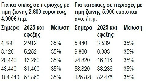 - για κατοικίες σε περιοχές με τιμές ζώνης από 2.800 έως 4.999 ευρώ/τ.μ. το τεκμαρτό θα προσαυξάνεται πλέον κατά 30% και όχι κατά 40%. Έτσι η αντικειμενική δαπάνη μειώνεται συνολικά κατά 35%