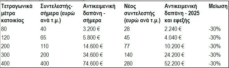 κατά 30% για κατοικίες σε περιοχές με Τιμή Ζώνης κάτω από 2.800 ευρώ ανά τετραγωνικό. Για σπίτια έως 80 τ.μ., ο συντελεστής μειώνεται από 40 σε 28 ευρώ ανά τ.μ. και η αντίστοιχη μείωση της αντικειμενικής δαπάνης από 3.200 ευρώ σε 2.240 ευρώ (-30%). Ενώ για κατοικίες 120 τ.μ., η αντικειμενική δαπάνη μειώνεται από 5.800 σε 4.040 ευρώ.