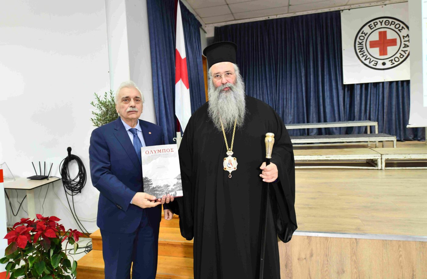 Την εκδήλωση χαιρέτισε ο Πρόεδρος του Περιφερειακού Τμήματος Κατερίνης του Ε.Ε.Σ., Σεβασμιώτατος Μητροπολίτης Κίτρους, Κατερίνης και Πλαταμώνος κ.κ. Γεώργιος, ο   οποίος συνεχάρη τους νέους εθελοντές, εξήρε τον Πρόεδρο του Ελληνικού Ερυθρού Σταυρού Δρ. Αυγερινό για την επιτυχημένη ανοδική πορεία του Ερυθοσταυρικού Κινήματος στην Ελλάδα και του δώρισε  ένα βιβλίο για το φυσικό μνημείο του Νομού Πιερίας τον “ΟΛΥΜΠΟ”,  εκδόσεως της Περιφερειακής Ενότητας Πιερίας.