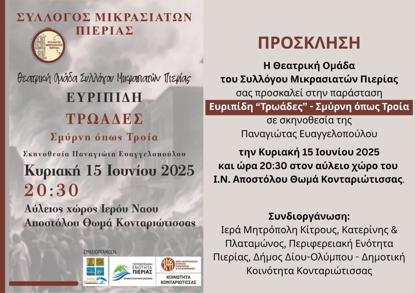 Η Θεατρική Ομάδα του Συλλόγου Μικρασιατών Πιερίας σας προσκαλεί στη θεατρική παράσταση Ευριπίδη “Τρωάδες” – Σμύρνη όπως Τροία σε σκηνοθεσία της Παναγιώτας Ευαγγελοπούλου την την Κυριακή 15 Ιουνίου 2025 και ώρα 20:30 στον αύλειο χώρο του Ι.Ν. Αποστόλου Θωμά Κονταριώτισσας.