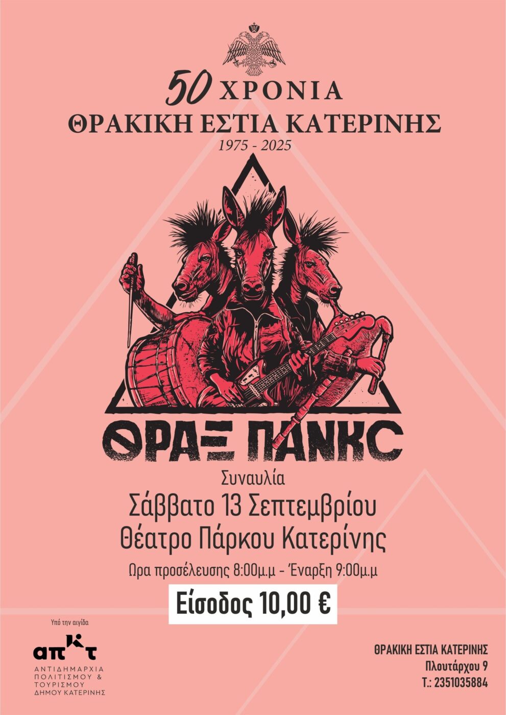 Στα πλαίσια των 50 Χρόνων της Θρακικής Εστίας Κατερίνης, σας προσκαλούμε στην  μεγάλη Συναυλία με τους ΘΡΑΞ ΠΑΝΚΣ το Σάββατο 13 Σεπτεμβρίου 2025 και Ώρα 21:00 μ.μ. (ώρα προσέλευσης 20:00) για μια αξέχαστη βραδιά με Θρακιώτικος ΡΟΚ & ΠΑΝΚ ήχους που χτυπούν στις καρδιές όλων!!!