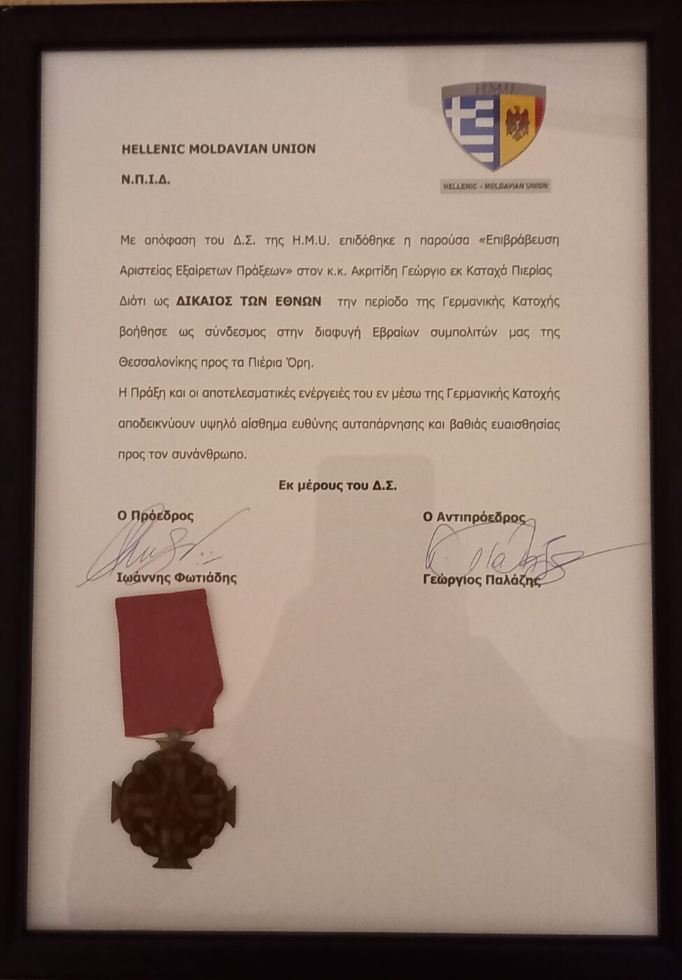 Ο Γεώργιος Ακριτίδης βραβεύθηκε «διότι ως Δίκαιος των Εθνών την περίοδο της Γερμανικής Κατοχής βοήθησε ως σύνδεσμος στη διαφυγή Εβραίων συμπολιτών μας της Θεσσαλονίκης προς τα Πιέρια Όρη».