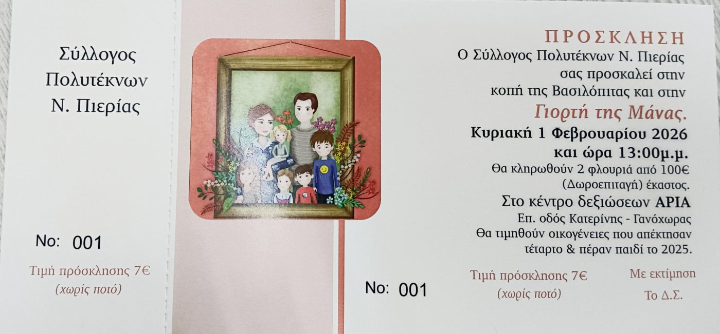Ο Σύλλογος Πολυτέκνων Ν. Πιερίας σας προσκαλεί στην κοπή της Βασιλόπιτας και στην