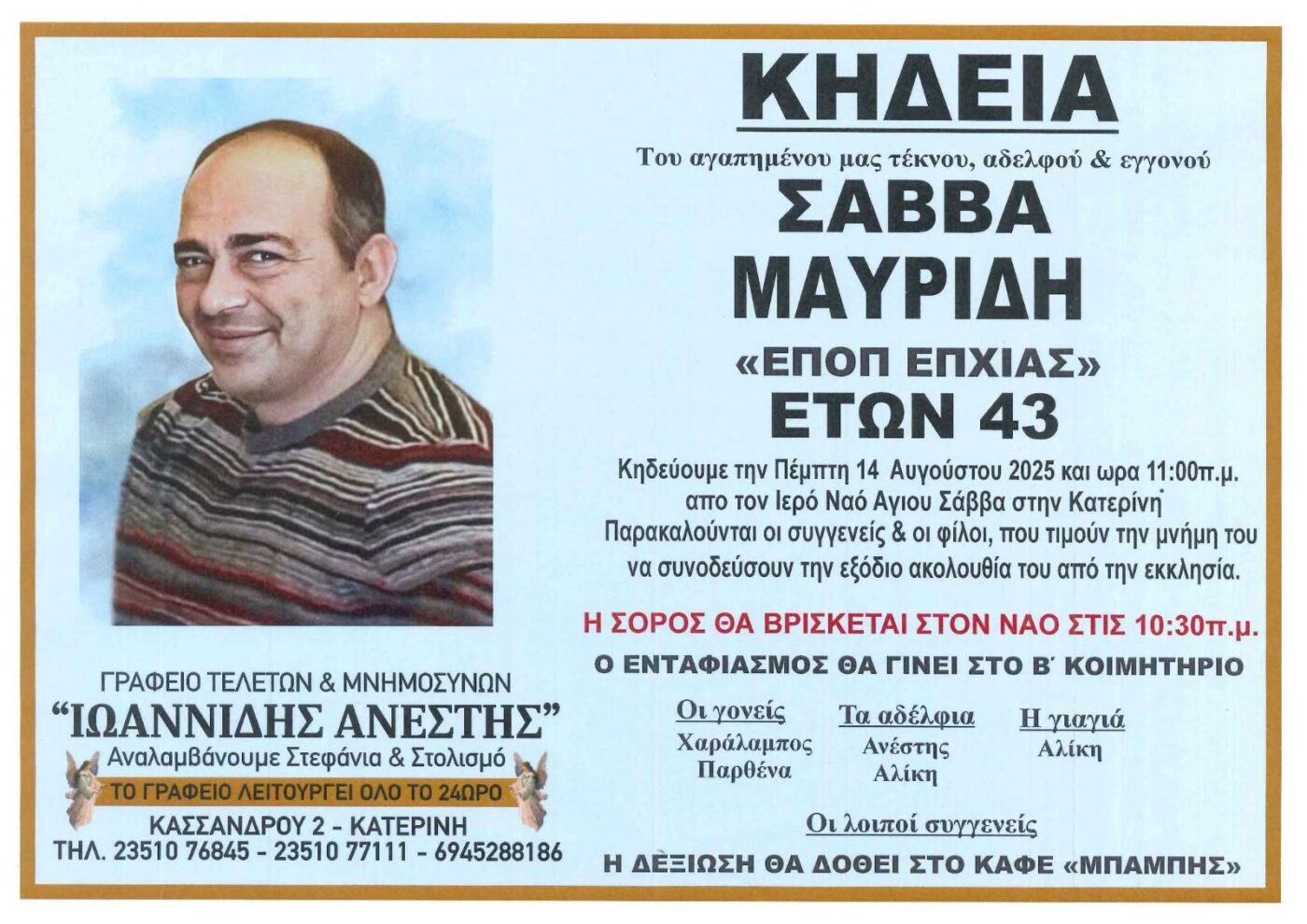 Την Πέμπτη 14 Αυγούστου, συγγενείς και φίλοι θα πουν το τελευταίο αντίο στον Σάββα Μαυρίδη, που έφυγε από τη ζωή σε ηλικία 44 ετών.