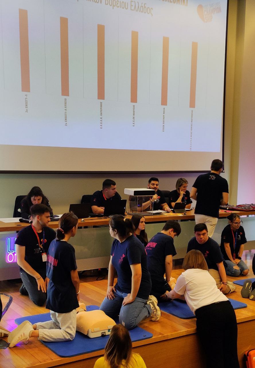 Τα παιδιά διαγωνίστηκαν εναλλάξ σε δεξιότητες ΚΑΡΠΑ για ένα τετράλεπτο σε ειδικά προπλάσματα με αισθητήρες, πετυχαίνοντας εντυπωσιακά ποσοστά επιτυχίας!