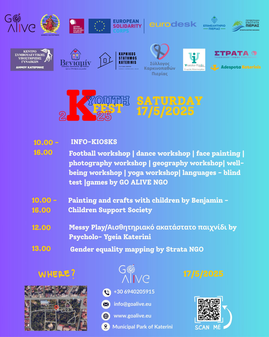 Με τη στήριξη της GO Alive, του Δήμου Κατερίνης, του Ιδρύματος Νεολαίας και Δια Βίου Μάθησης, του Επιμελητηρίου Πιερίας, της Περιφερειακής Ενότητας Νομού Πιερίας του European Solidarity Corps και τοπικών φορέων.