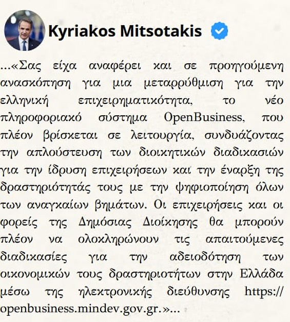 Ιδιαίτερη έμφαση στη νέα μεταρρύθμιση που αφορά την απλούστευση και ψηφιοποίηση της αδειοδότησης επιχειρήσεων μέσω του πληροφοριακού συστήματος OpenBusiness έδωσε ο πρωθυπουργός Κυριάκος Μητσοτάκης, στη καθιερωμένη εβδομαδιαία ανασκόπησή του.