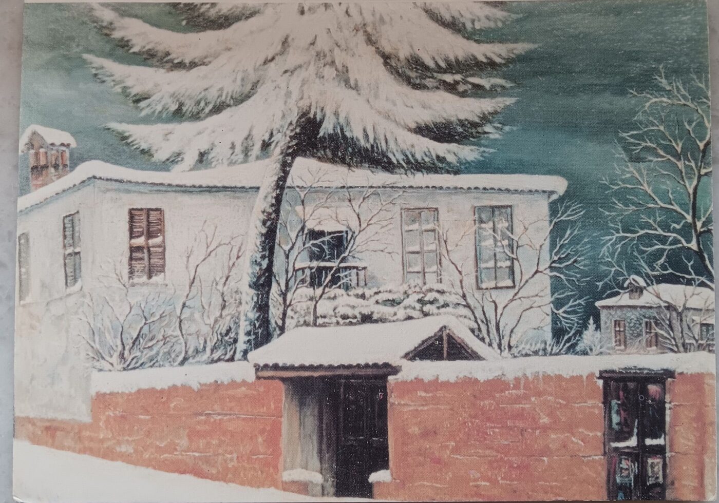 Η οικία της ναυτικής οικογένειας Κωφού κοντά στο Παζάρι, απέναντι από τα σπίτια των Γρηγορίου Λεμόνα και Ιωάννου Μαρούκη. Η οικογένεια ήταν πολυμελής με 6 τέκνα : ο Μιχάλης, ο Λευτέρης μαχητής του ΔΣΕ πρόσφυγας σε Ανατολική χώρα, ο Νικόλαος , η Μαρία (σύζυγος Τσίντσηφα), η Αικατερίνη (σύζυγος Σβάρνα) και η Ελένη (σύζυγος Τσιαμίχα). Δίπλα ακριβώς _ δεν αποτυπώνεται στην ζωγραφική γιατί είναι στο βάθος του οικοπέδου _ υπάρχει και σήμερα διατηρητέο το σπίτι του ήρωα Μιχαήλ Κωφού, του πλοηγού που με τον Νικόλαο Βλαχόπουλο βοήθησαν στις 18 Οκτωβρίου 1912 τον Νικόλαο Βότση να τορπιλήσει το Φετχί Μπουλέντ…. Αριστερά μετά την οικία Κωφού ξεχωρίζει το σπίτι του Ιωάννη Σακελλαρίδη (από την Καρυά Ολύμπου, σύζυγος της Κλεαρέτης Τριανταφύλλου). Δίπλα του η οικία του Αποστόλου Τσάλη(Τσαλόπουλου). Σήμερα το σπίτι του Κωφού έχει κατεδαφιστεί και όπως εξακριβώνεται, όταν το ζωγράφισε ο Κυπαρισσάς δεν κατοικούνταν πλέον.