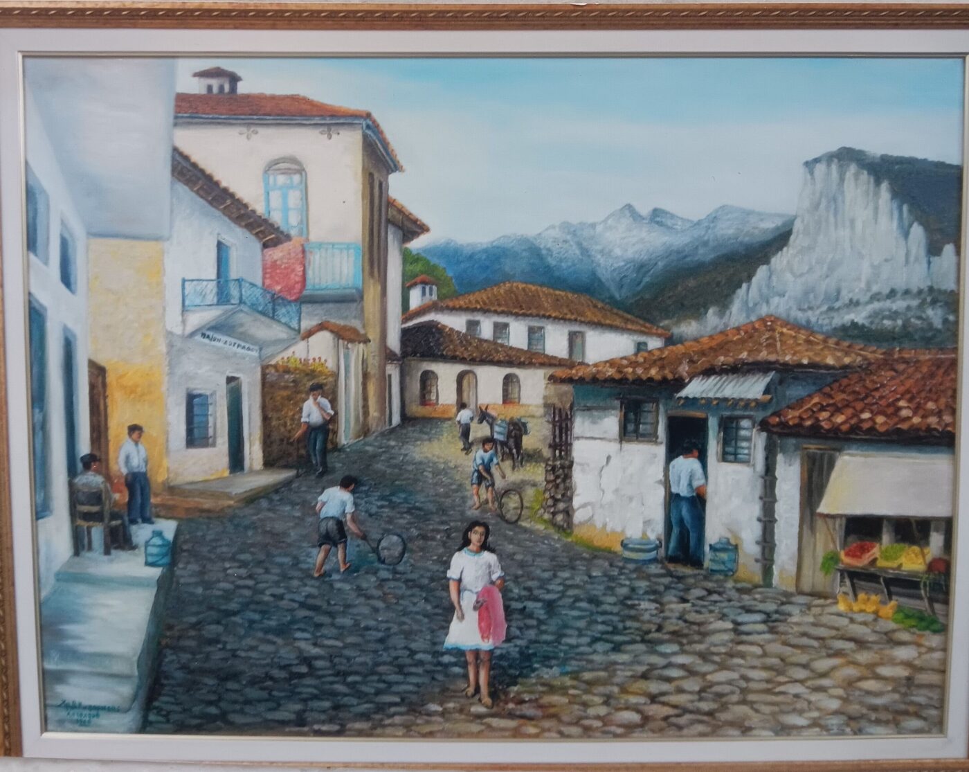 Ο δρόμος στο Παζάρι. Ο μεγάλος λαϊκός ζωγράφος Χρήστος Κυπαρισσάς ζωγράφισε το πλάνο αυτό αντλώντας στοιχεία από προπολεμική φωτογραφία που την εμπλούτισε με νεότερα. Εντυπωσιάζει το λιθόστρωτο και οι φιγούρες των ατόμων. Δεξιά είναι το μεγάλο γωνιακό οικόπεδο του Νικολάκη Γεωργουλή με τα μαγαζιά. Στο βάθος είναι τα Φαργκανέϊκα. Από αριστερά πρώτο μόλις ξεχωρίζει το ξενοδοχείο του Ξενοφώντα Γκουλέμα κτισμένο το 1939. Μετά είναι το<< Γαλακτοπωλείον Η Στάνη >> του ΔημητρίουΔαδούλης με τις γκαζίνες μπροστά. Κατόπιν των Γεωργίου και Ιωάννη Ζωγράφου. Μετά το μακρόστενο οικόπεδο του Τσιώτα (με γαμπρό τον Καρτσιώτη). Το επόμενο είναι του Δημητρίου Μήλιου και τελειώνει η φωτογραφία με το Καναβουραίϊκο.