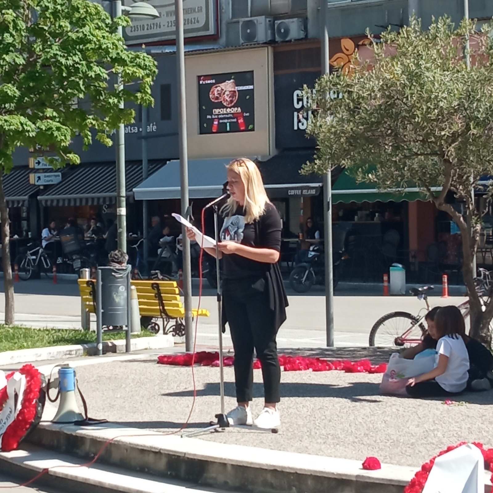 Ιστορική αναδρομή στην καθιέρωση της Πρωτομαγιάς στη χώρα μας έκανε η πρόεδρος του Συλλόγου Εργαζομένων Αντιπεριφέρειας Πιερίας, Δομνίκη Καράντζιου και τον αγώνα των εργατών για 8ωρο,και την Κυριακάτικη αργία ανάμεσα σε άλλα αιτήματα, κάνοντας σαφές πως αγώνας για το δικαίωμα στη σταθερή δουλειά με δικαιώματα παραμένει επίκαιρος.