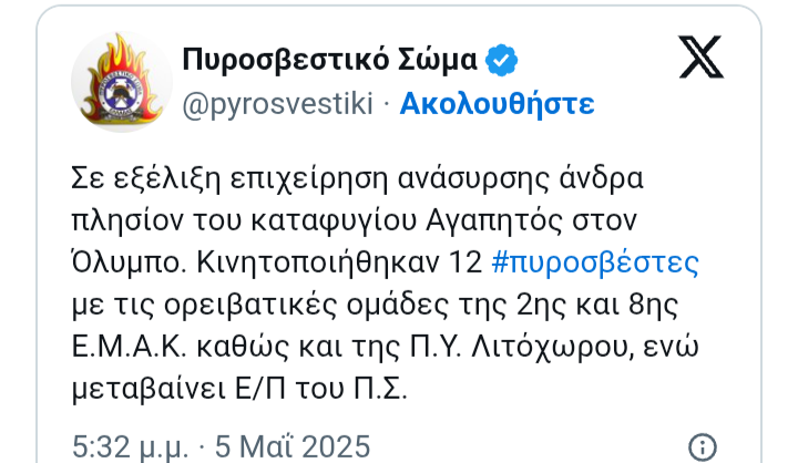 Σε εξέλιξη βρίσκεται αυτήν την ώρα μεγάλη επιχείρηση της Πυροσβεστικής στον Όλυμπο, για την ανάσυρση άνδρα από το καταφύγιο Αγαπητός. Σύμφωνα με την πυροσβεστική, έχουν κινητοποιηθεί 12 πυροσβέστες με τις ορειβατικές ομάδες της 2ης και 8ης Ε.Μ.Α.Κ. καθώς και της Π.Υ. Λιτόχωρου, ενώ στην περιοχή μεταβαίνει και ελικόπτερο του Πυροσβεστικού Σώματος.