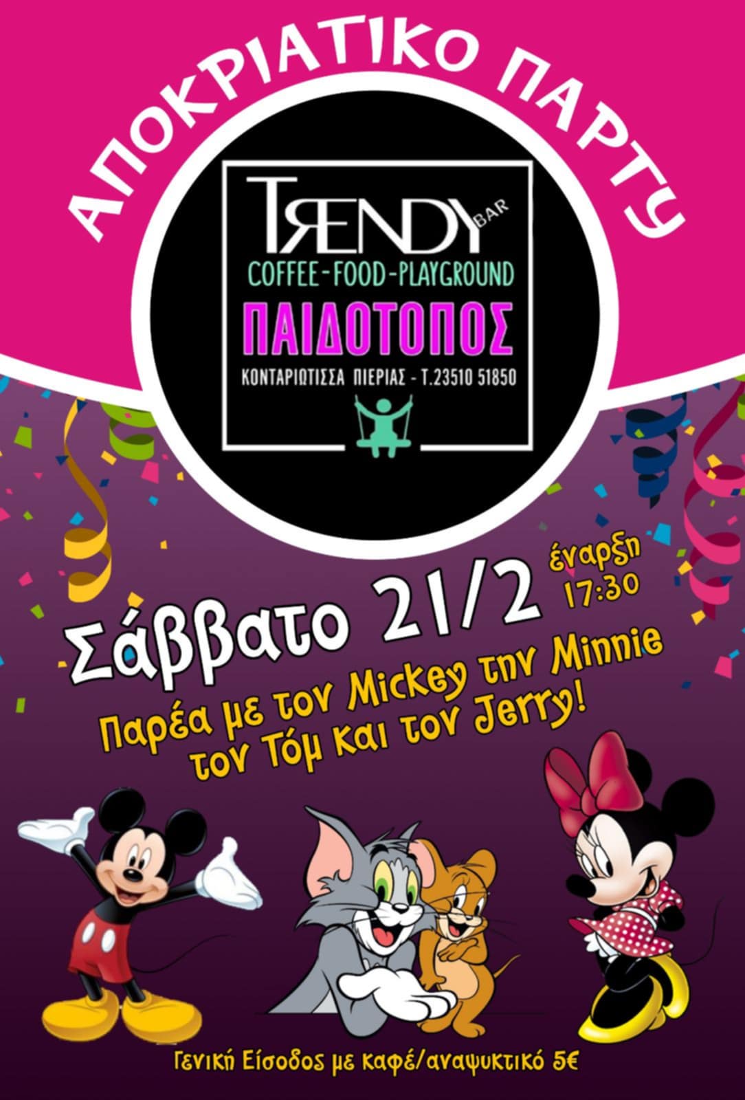Το Trendy είναι ένας παιδότοπος, στην Κονταριώτισσα, φτιαγμένος για τους μικρούς μας φίλους με αγάπη. Παράλληλα, εσείς έχετε τη δυνατότητα να απολαύσετε τον καφέ σας με την παρέα σας, καθώς και φαγητά της ώρας, burgers, πίτσες και κλαμπ σάντουιτς.