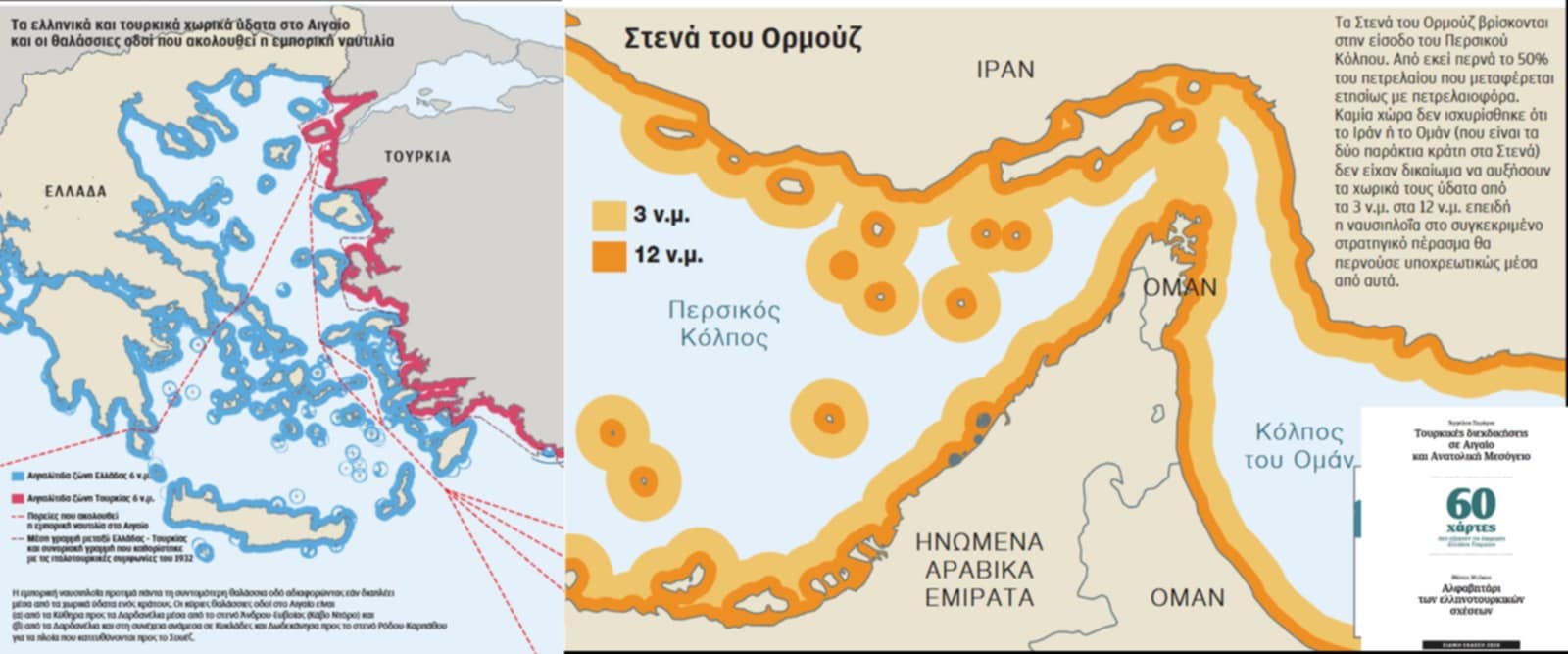 Για το θέμα έχει γράψει σχετικά ο Άγγελος Συρίγος, Καθηγητής Διεθνούς Δικαίου και νυν Βουλευτής της ΝΔ, σε μία εξαιρετική έκδοση της Καθημερινής το 2020 για τις τουρκικές διεκδικήσεις στο Αιγαίο. Εκεί αναφέρει το παράδειγμα των στενών του ΟΡΜΟΥΖ, ενός στρατηγικού σημείου μεταξύ ΙΡΑΝ και ΟΜΑΝ από το οποίο περνά το 50% του πετρελαίου. Και οι δύο χώρες στην περιοχή αυτή έχουν καθορίσει 12 ν.μ. Χωρικά Ύδατα. Διαμαρτυρήθηκε κανείς ότι έτσι περιορίζεται η διεθνής ναυσιπλοΐα; Φυσικά και όχι, αφού η διέλευση των εμπορικών και άλλων πλοίων πραγματοποιείται απρόσκοπτα.