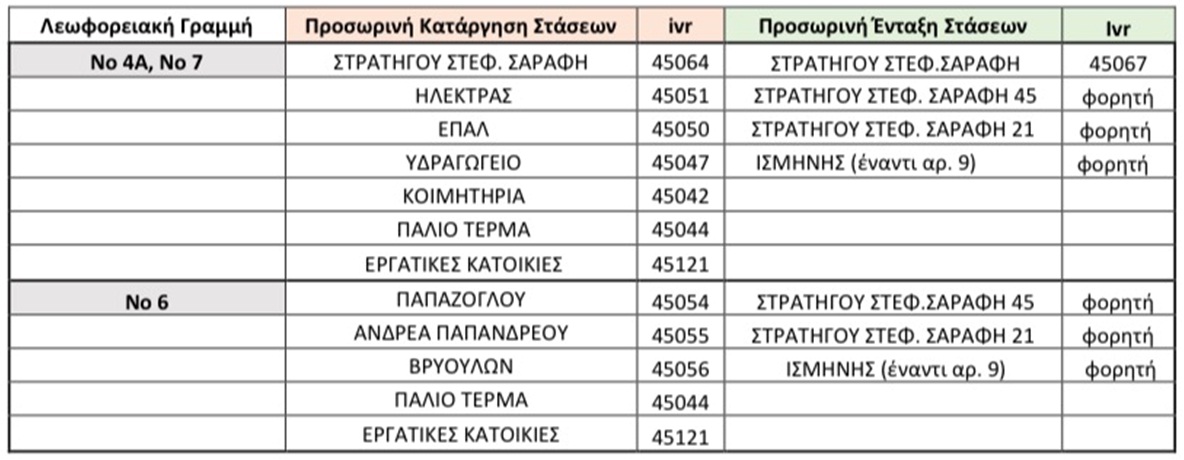 Για την καλύτερη εξυπηρέτηση του επιβατικού κοινού ιδρύονται προσωρινά στάσεις στις οδούς Στρατηγού Σαράφη 45, Στρατηγού Σαράφη 21 και Ισμήνης ενώ καταργούνται στάσεις στην οδό Στρατηγού Σαράφη, Ηλέκτρας, ΕΠΑΛ, Υδραγωγείο, Κοιμητήρια, Παλιό Τέρμα, Εργατικές κατοικίες και Παπάζογλου, Α. Παπανδρέου, Βρυούλων.