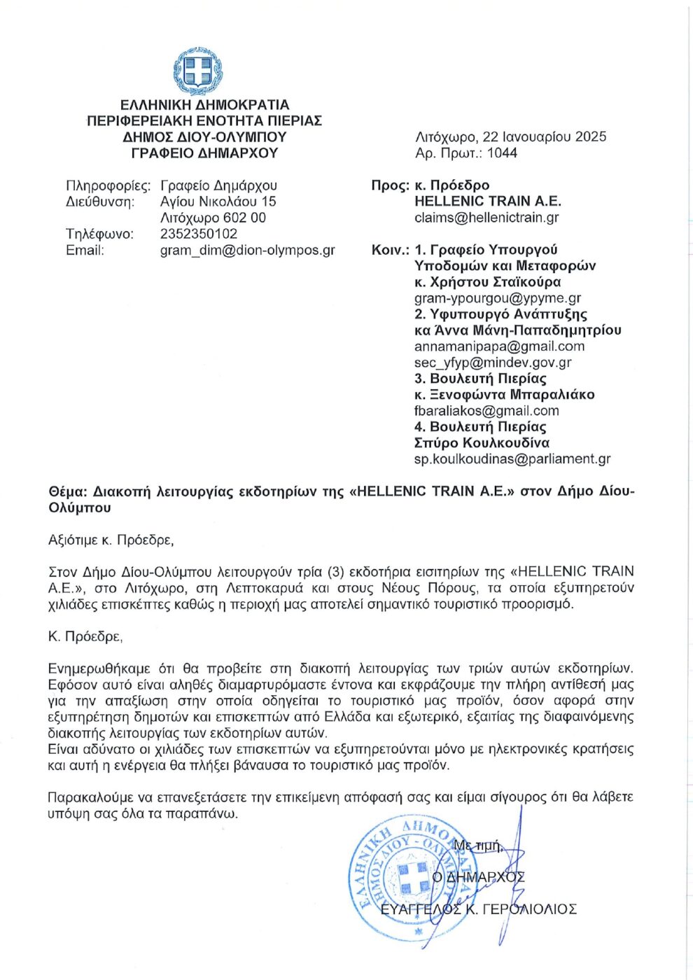 Σας γνωρίζω ότι, την Πέμπτη 23-01-2025, μου κοινοποιήθηκε από πολίτη της περιοχής μας, το αρ. πρωτ. 1044/22-01-2025 έγγραφό σας και, συγκεκριμένα, του Γραφείου Δημάρχου του Δήμου Δίου-Ολύμπου, με Θέμα: “Διακοπή λειτουργίας των εκδοτηρίων της «HELLENIC TRAIN A.E» στον Δήμο Δίου-Ολύμπου” (εικόνα 3).