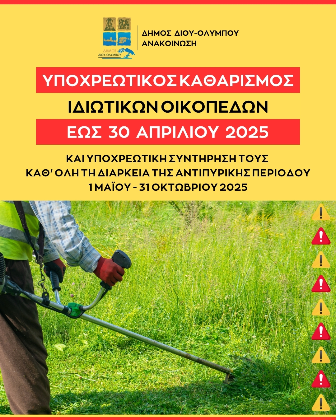 O Δήμος Δίου-Ολύμπου υπενθυμίζει και καλεί τους ιδιοκτήτες, νομείς, επικαρπωτές και μισθωτές οικοπέδων ή λοιπών ακάλυπτων χώρων που βρίσκονται εντός σχεδίου, να προβούν στον υποχρεωτικό καθαρισμό των οικοπέδων αυτών έως την 30η Απριλίου 2025, στο πλαίσιο πρόληψης πρόκλησης πυρκαγιάς ή ταχείας επέκτασής της.